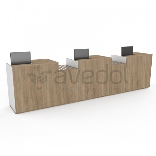 Conjunto de três balcões com móvel de apoio a compras.