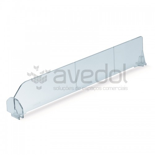 Divisória com batente duplo para organizar as embalagens e produtos nas prateleiras.