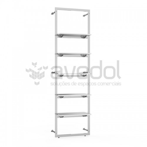 Estante com aro e acessórios cromados e prateleiras laminadas, adequada para equipar lojas e espaços comerciais.