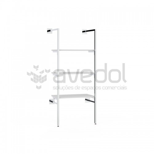 Estante com prumos e acessórios cromados e prateleiras laminadas para fixar na parede.